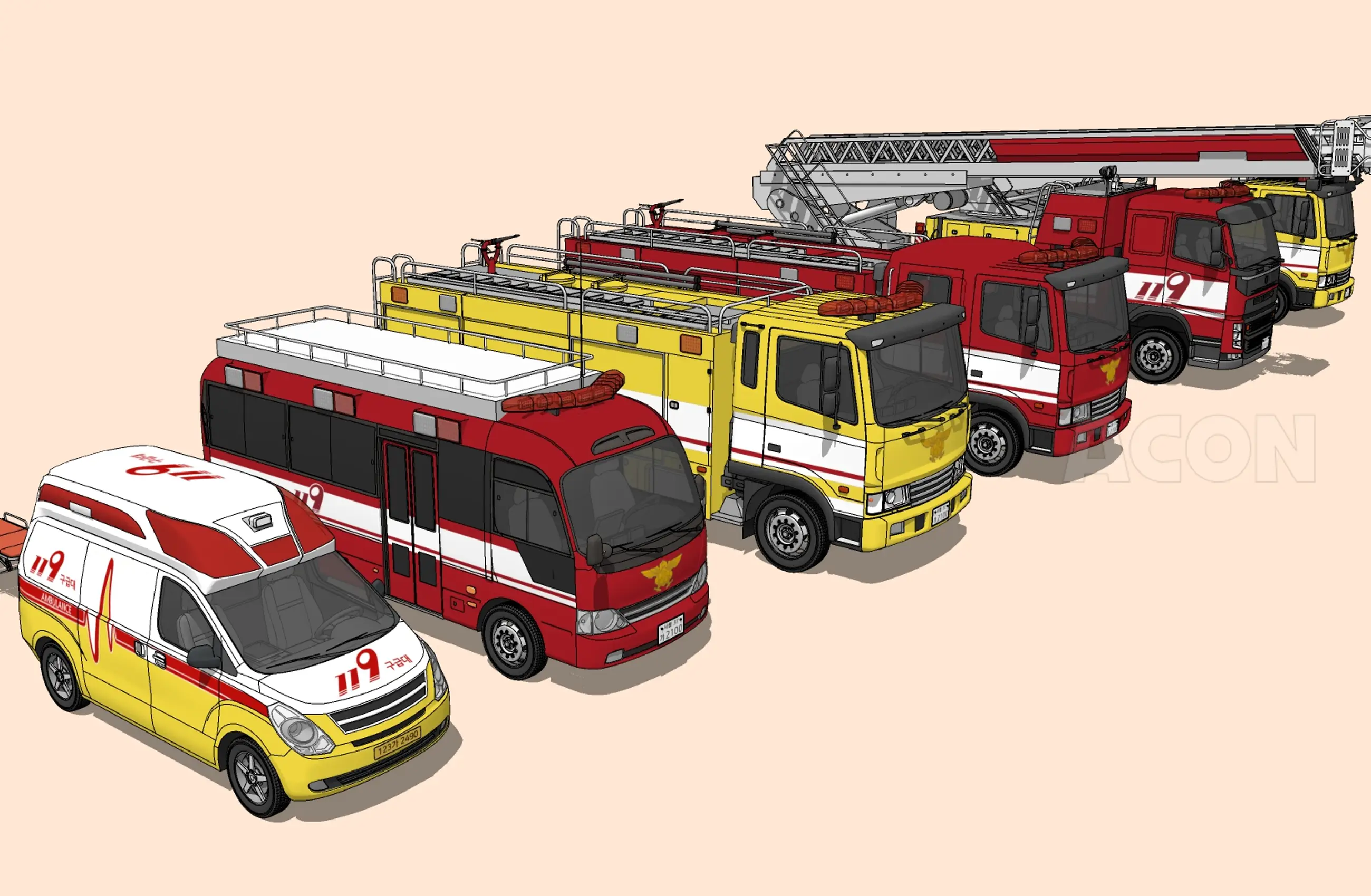 펌프차, 물탱크차, 구조차 등 특수화된 소방차 제작.